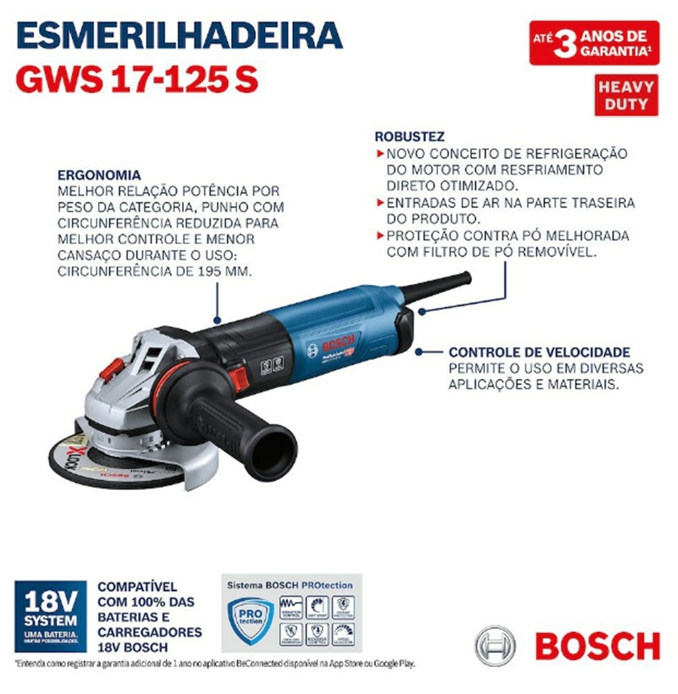 A GWS 17-125 S Professional é melhor para esmerilhar metal ou juntas soldadas e para cortar metal, concreto, tijolos e ladrilhos. Ela é compatível com os sistemas de extração do pó da Bosch GDE 125 EA-T Professional e GDE 115 / 125 FC-T Professional. A esmerilhadeira angular pequena dispõe de velocidade constante, partida suave e proteção contra sobrecarga.
